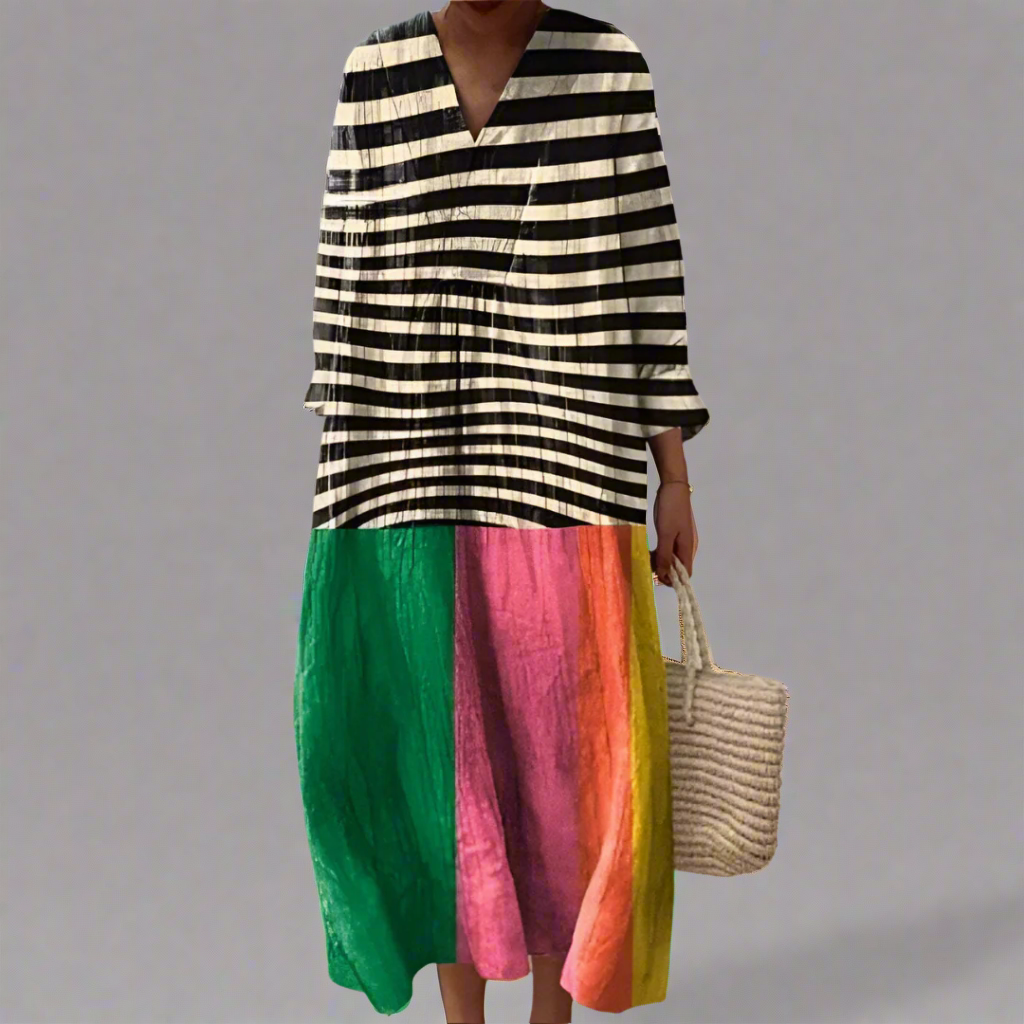 Discover art and elegance with our geometric dress Gabriela, one of our most beloved products. This modern design blends with a timeless charm, featuring dream-inspired patterns that capture attention. The flowing silhouette enhances every figure, ensuring comfort and style for any special occasion or to elevate your everyday look.