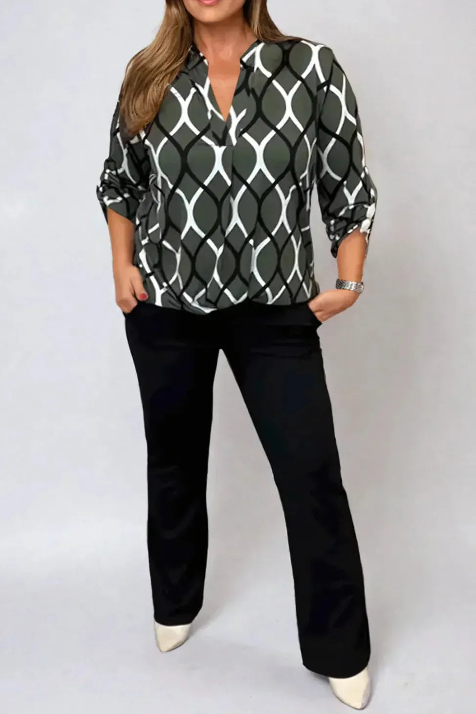 The Casual Blouse With Long Sleeves And Elegant Pattern brings together laid-back comfort and standout style. With its bold, lattice-inspired print and flattering silhouette, this blouse is a versatile choice for both workdays and weekends. It’s a wardrobe staple that feels polished without being too formal. Designed with long roll-tab sleeves, and a soft, fluid drape, it provides ease of movement and effortless wearability. Whether tucked into trousers or worn loose with jeans, this blouse delivers impact with minimal effort.