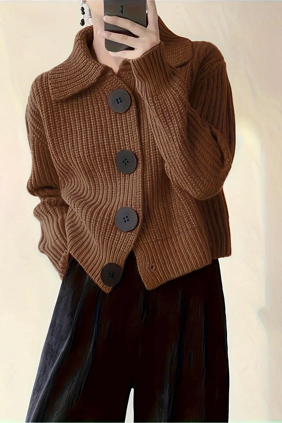 • Style: Chunky ribbed texture with oversized buttons and structured collar