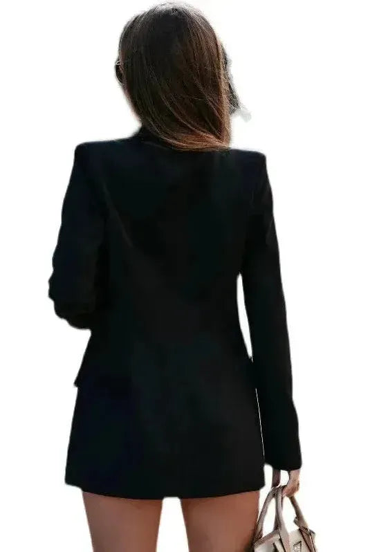 This longline blazer features a tailored cut with sharp lapels and a four-button front for added structure. Large flap pockets with button details enhance its utility-inspired style. With its mid-thigh length and lightly padded shoulders, it offers a balanced, flattering silhouette that works perfectly for layering over both casual and dressy outfits.