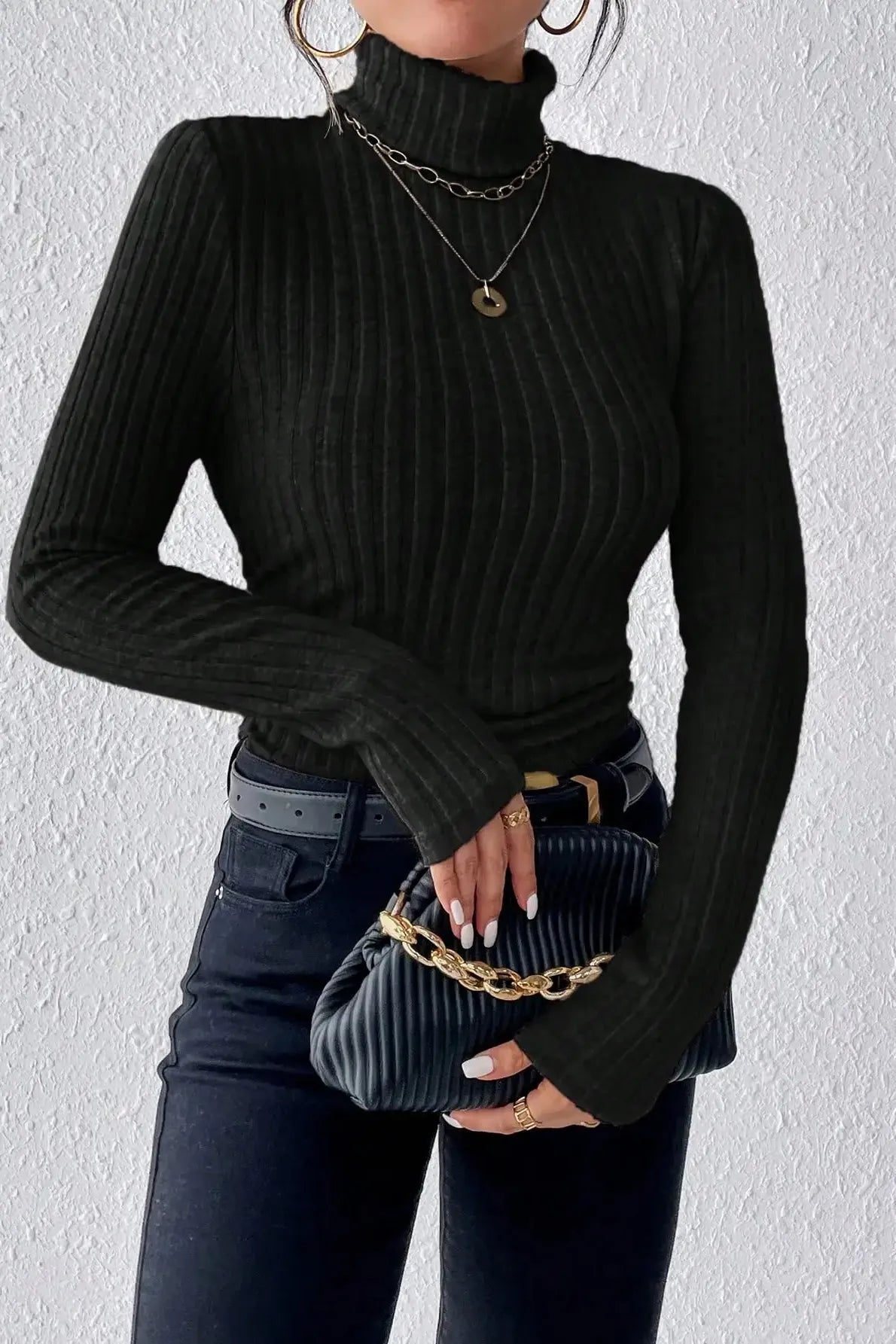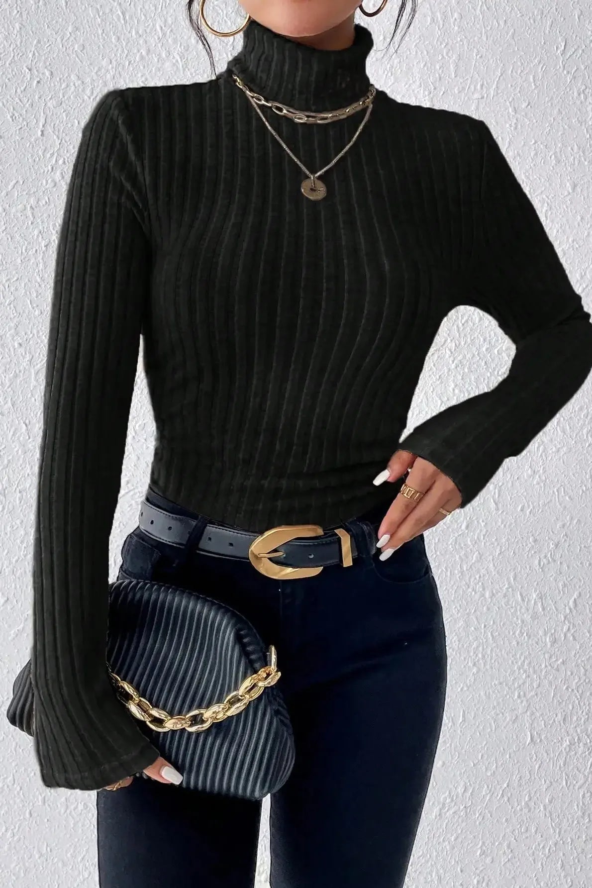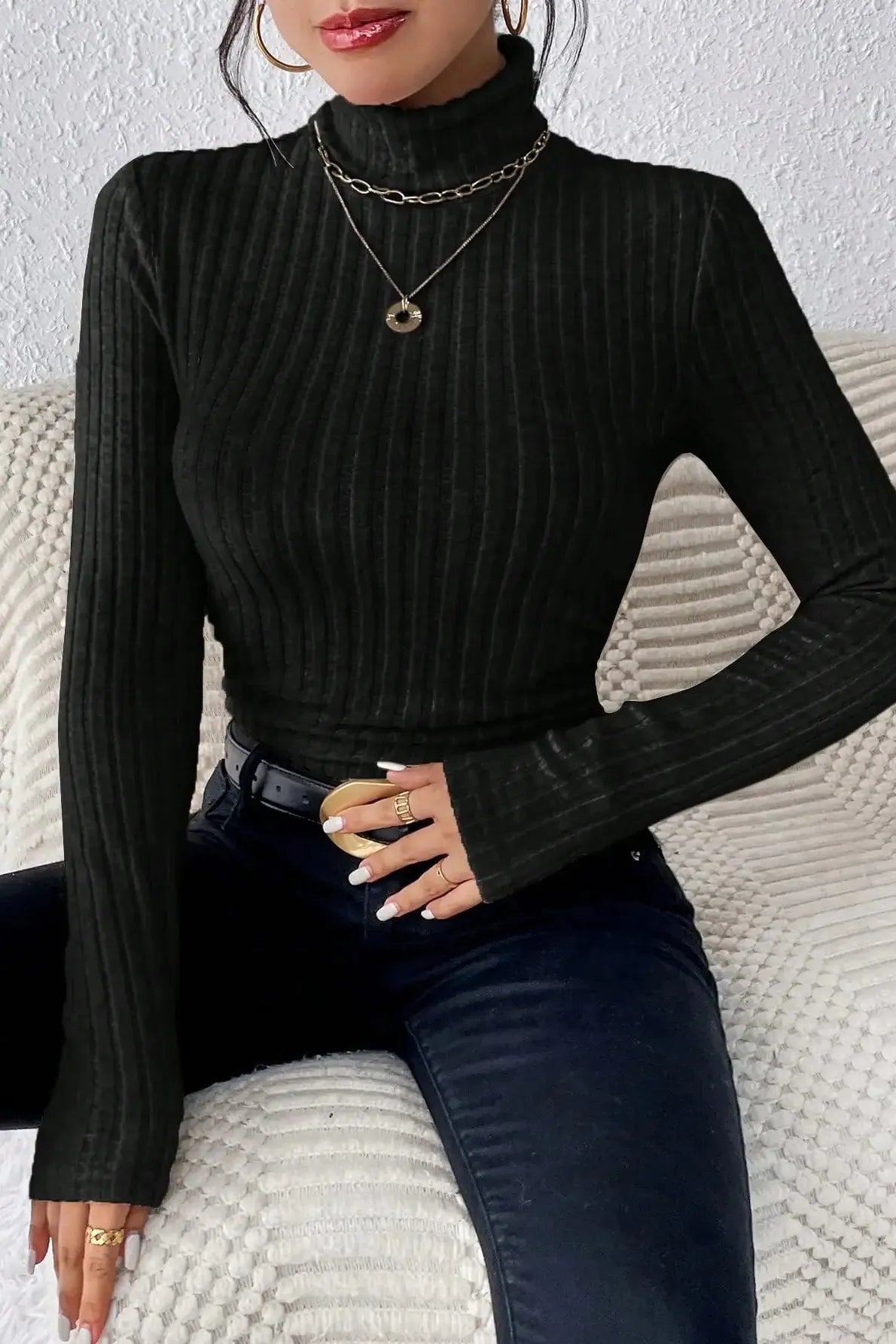 The Knitted Turtleneck Longsleeve is that wardrobe essential you’ll reach for again and again. With its refined ribbed texture, high neckline, and figure-hugging silhouette, it’s built to make cold days feel sleek, polished, and undeniably chic. Designed to keep you cozy without the bulk, this top slips effortlessly under a coat or stands strong on its own with a pair of high-waisted jeans. Whether you're heading to a coffee date or powering through a workday, the soft stretch and slim fit keep you looking sharp and feeling relaxed.