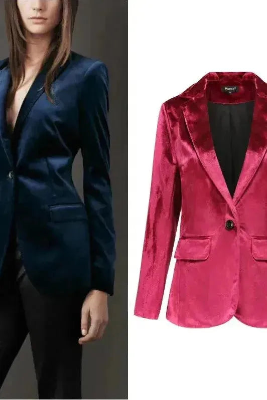 This expertly tailored blazer features a rich, velvet finish and a single-button closure for a clean, structured silhouette. Subtle gold-tone buttons accent the cuff for an elegant detail, while sharp lapels and softly padded shoulders offer classic polish. The fitted shape pairs effortlessly with relaxed denim or dressier options for a refined yet versatile look.