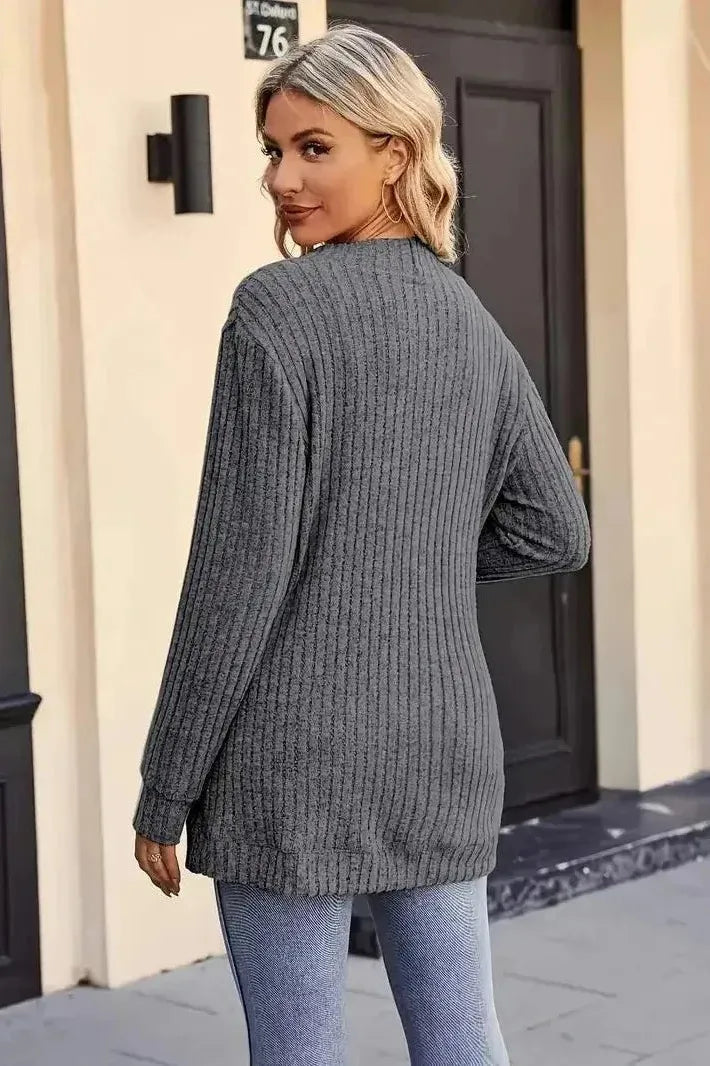 This relaxed open-front cardigan features a vertical ribbed knit that flatters and elongates the silhouette. The fitted sleeves and wide ribbed trim provide a clean, polished look, while two front patch pockets add both function and charm. A go-to layer that transitions seamlessly from home comfort to out-and-about style.