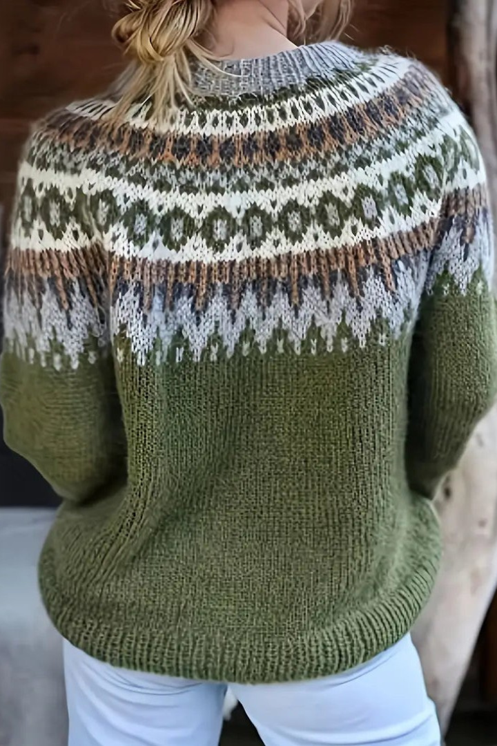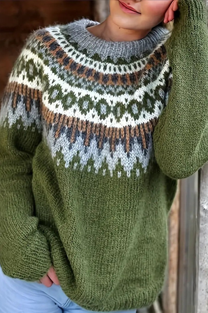 The Nayla Elegant Sweater captures the beauty of classic craftsmanship with a refined Nordic twist. Featuring a rich forest green base and intricate colourwork around the yoke, this sweater blends elegance with rustic charm, perfect for those who love timeless style with a touch of modern softness. Crafted for both comfort and presence, Nayla offers a flattering relaxed fit, cozy warmth, and an eye-catching neckline that frames the face beautifully. It’s ideal for countryside getaways, casual gatherings, or simply elevating your everyday winter look.