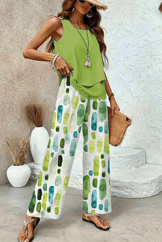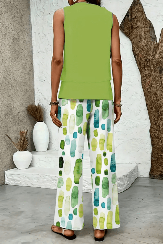 • Style: Sleeveless green top with abstract print wide-leg pants