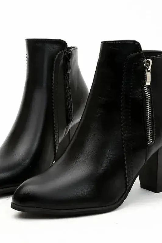 These statement leather boots feature a retro-inspired chunky heel and sleek ankle-high silhouette that combines vintage charm with modern ease. Smooth leather finish and subtle seam detailing create a polished, refined look. The sturdy block heel offers stability and elevation, while the structured shape ensures both fashion and functionality for everyday wear.
