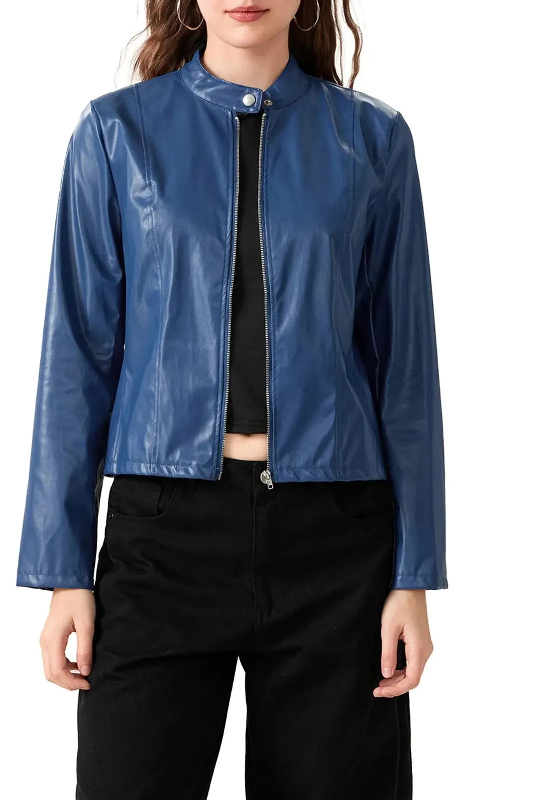 This leather jacket showcases a flattering, feminine cut with clean lines and subtle seams that enhance the silhouette. Featuring a smooth finish and classic front zip, it brings refined edge to both casual and dressier outfits. A perfect balance of structure and style for women who appreciate timeless fashion.