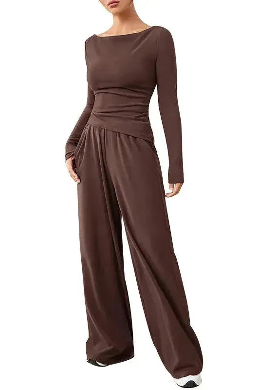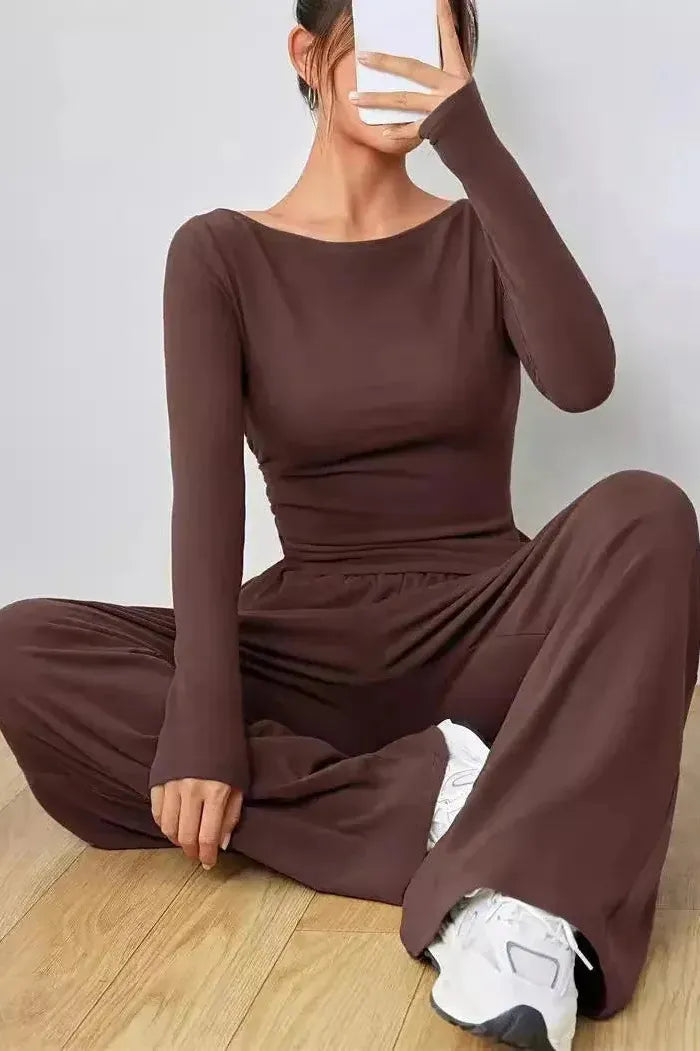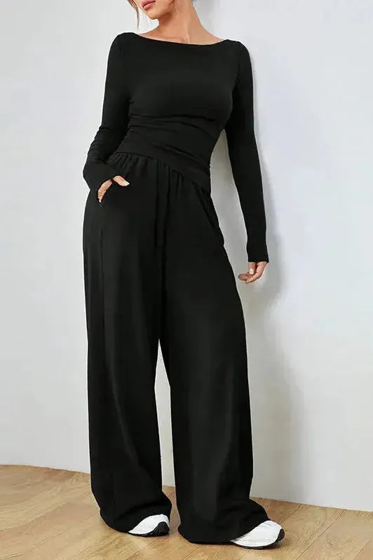 • Style: Long-sleeve stretch top with high-waist wide-leg bottoms